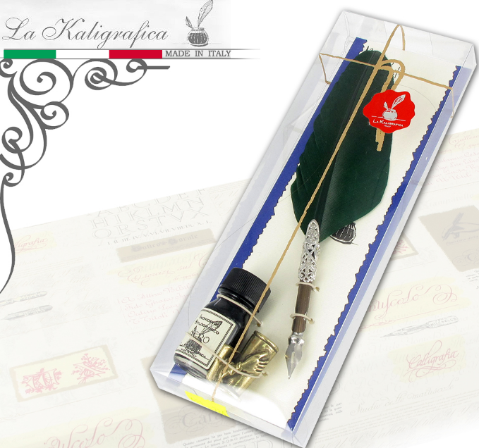 La Kaligrafica – kaligrafické ale i bežné prepisovacie perá v štýlovom retro vintage dizajne od talianskeho prémiového výrobcu. Krásny praktický darček v adekvátnom darčekovom balení. Kalamár má stojan v podobe mosadznej nožičky.