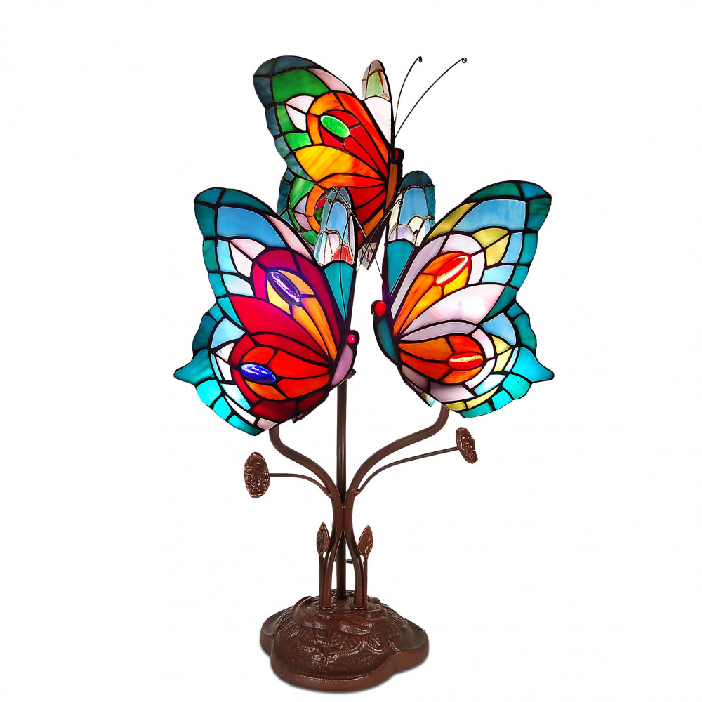 Luxusná vitrážová tiffany lampa s motívom pestrých motýľov na podstavci v tvare rastlinky.